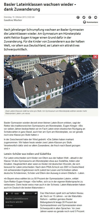 Zum Latein-Boom in Basel berichtet Gaudenz Wacker (SRF) u. a. aus dem Gymnasium am Münsterplatz. Der Link zum Original-Beitrag vom 15.10.2013:
