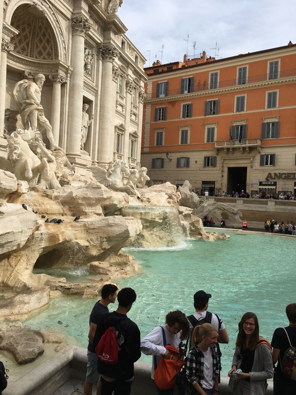 Am nächsten Tag ging es jesuitisch weiter: Nach dem Besuch der beiden Hauptkirchen des Jesuitenor­dens, San Ignazio und Il Gesù mit ihren spektakulär dreidimensionalen Deckenmalereien ging es dann doch wieder zurück in die Antike, wo uns Elisabeth mit den Eigenheiten dieses sonderba­ren Baus vertraut machte, der die Architekturgeschichte massgeblich beeinflusst hat (vom Petersdom bis zum Basler Messeneubau …). An der Grabinschrift des im Pantheon bestatteten Ma­lers Raffael sind übrigens schon Lateinlehrer gescheitert: Ille hic est Raphael, timuit quo sospite vinci / rerum magna parens et moriente mori (wer’s wissen will, findet hier Aufklärung). Über die Piazza Navona, ehemals Stadion des Domitian und immer noch stadionförmig, als hätte man die Fläche, auf der so viele Christen umkamen, in den letzten 2000 Jahren nie bebauen wol­len, gingen wir vorbei an Berninis Vierströmebrunnen zu dem wohl grössten und beeindruckends­ten Brunnen Roms: der Fontana di Trevi, über die Emanuel uns kundig informierte.