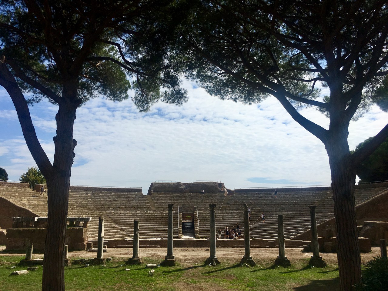 Nach einem laokoonischen Kampf mit den römischen Fahrkartenautomaten konnten wir starten und ge­langten zunächst zu einer römischen Pyramide, die sich der antike Ägyptenfan Caius Cestius als Grabmal erbauen liess. An dieser Pyramide befinden sich weitere interessante Grabmale: Es handelt sich um den nichtkatholischen Friedhof Roms, auf dem sich über die Jahrhunderte Juden, Moslems, Or­thodoxe und Protestanten bestatten liessen, unter anderem die englischen Dichter Shelley und Keats, letzterer mit der beeindruckend falschbescheidenen Inschrift Here lies One Whose Name was writ in Water. Magdalena führte uns an diesem verwunschenen Ort, bis wir schliesslich wieder in den Zug stiegen und nach Ostia fuhren. Hier übernahm Federico und berichtete uns über die Ge­schichte der römischen Hafenstadt, die bis heute in recht gutem Erhaltungszustand besuchbar ist.