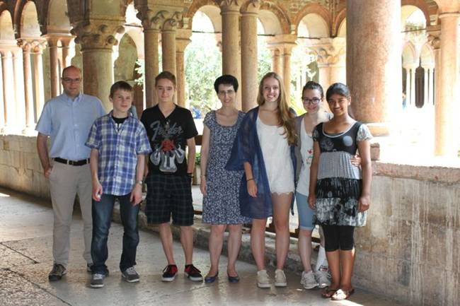 So machten wir uns schliesslich auf den Weg zu unserem Drei-Sterne-Hotel namens „Novo Hotel Rossi“, welches nur 200m vom Bahnhof entfernt liegt und welches wir so ohne Probleme zu Fuss erreichen konnten. Im Hotel erwarteten uns freundliches Personal und hübsch eingerichtete Hotelzimmer. Wir waren sofort zufrieden mit der Einrichtung und machten uns daran, unsere Sachen in den Schränken zu verstauen. Um 14.30 Uhr trafen wir uns wieder in der Eingangshalle und machten uns auf den Weg ins Zentrum. Nach 20 Minuten erreichten wir die grosse Piazza Bra, wo Leo seinen Vortrag zur Geschichte Veronas hielt. Frau Bloch empfahl uns, um uns von der Hitze, welche bei durchschnittlich 35°C lag, abzukühlen, sogenannte Granitas, welche vorzüglich schmeckten und auch ihren Zweck erfüllten. Abgekühlt und voller Energie gingen wir in die Arena, welche direkt an der Piazza Bra liegt. Dort hörten wir uns Florinas Vortrag zu der Arena an. Mit diesem Hintergrundswissen versehen, sahen wir die Arena nun mit anderen Augen. Vorher wussten wir zum Beispiel nicht, dass die Arena das drittgrösste aller erhaltenen antiken Amphitheater ist. Nach der Arena gingen wir zur Casa di Giulietta, wo uns der wohl berühmteste Balkon Veronas, der Balkon von Julia sowie ihre Statue erwarteten. Verwunderten sahen wir den vielen Touristen zu, wie sie ihre Hand auf Julias Brust legten und erfuhren erst später, dass diese Geste Glück in der Liebe bringen soll. Nach diesem Besuch hatten wir bis zum Abendessen freie Zeit und so schlenderten wir gemütlich durch die Shopping-Meile Veronas, wo wir dieses und jenes in den Geschäften kauften. Mit vollen Taschen kehrten wir zum Restaurant „Brek“ – ein Tipp von Frau Bloch - zurück und assen dort zu Nacht. Da man in diesem Restaurant das Gedeck nicht bezahlen musste, assen wir auch an den folgenden zwei Tagen dort, und wir können dieses Restaurant nur weiterempfehlen, denn es ist preiswert und lecker. Am Ende dieses schönen Abends gingen wir zurück ins Hotel, legten uns nach einem anstrengenden, aber doch gelungenen Tag ins Bett und schliefen schnell ein.