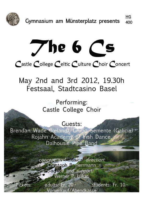 60 Schülerinnen und Schüler der 2. Klassen des Gymnasiums am Münsterplatz Basel haben sich seit letztem Sommer mit Musik aus den keltischen Restgebieten Europas auseinandergesetzt. Dabei haben sie ein Programm mit 17 sehr unterschiedlichen Liedern und Instrumentalstücken erarbeitet, welches nun Anfang Mai präsentiert wird. Es stehen bis zu 120 Personen gleichzeitig auf der Bühne. Aber auch traditionelle, klein besetzte Stücke sind vertreten.