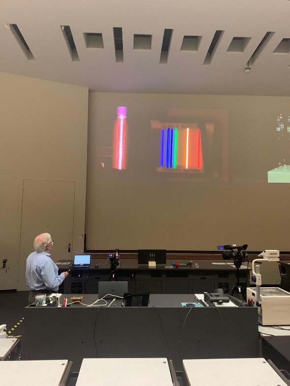 Nach der Einführung im Klassenzimmer zu dem eher neueren Gebiet der Physik, gab uns Herr Prof. Dr. Bernd Krusche, mit seinem Vortrag an der Universität, welchen er mit spannenden Experimenten veranschaulichte, ein besseres Verständnis für die Teilchenphysik. Als Einstieg erklärte uns Herr Krusche die Grundlagen der Teilchenphysik sowie die allerersten Ansätze der Quantenmechanik. Dabei zeigte er uns die verschiedenen Energieniveaus von verschiedenen Elementen wie z.B. von Heliumgas oder Wasserstoff auf (siehe Abb. 1).