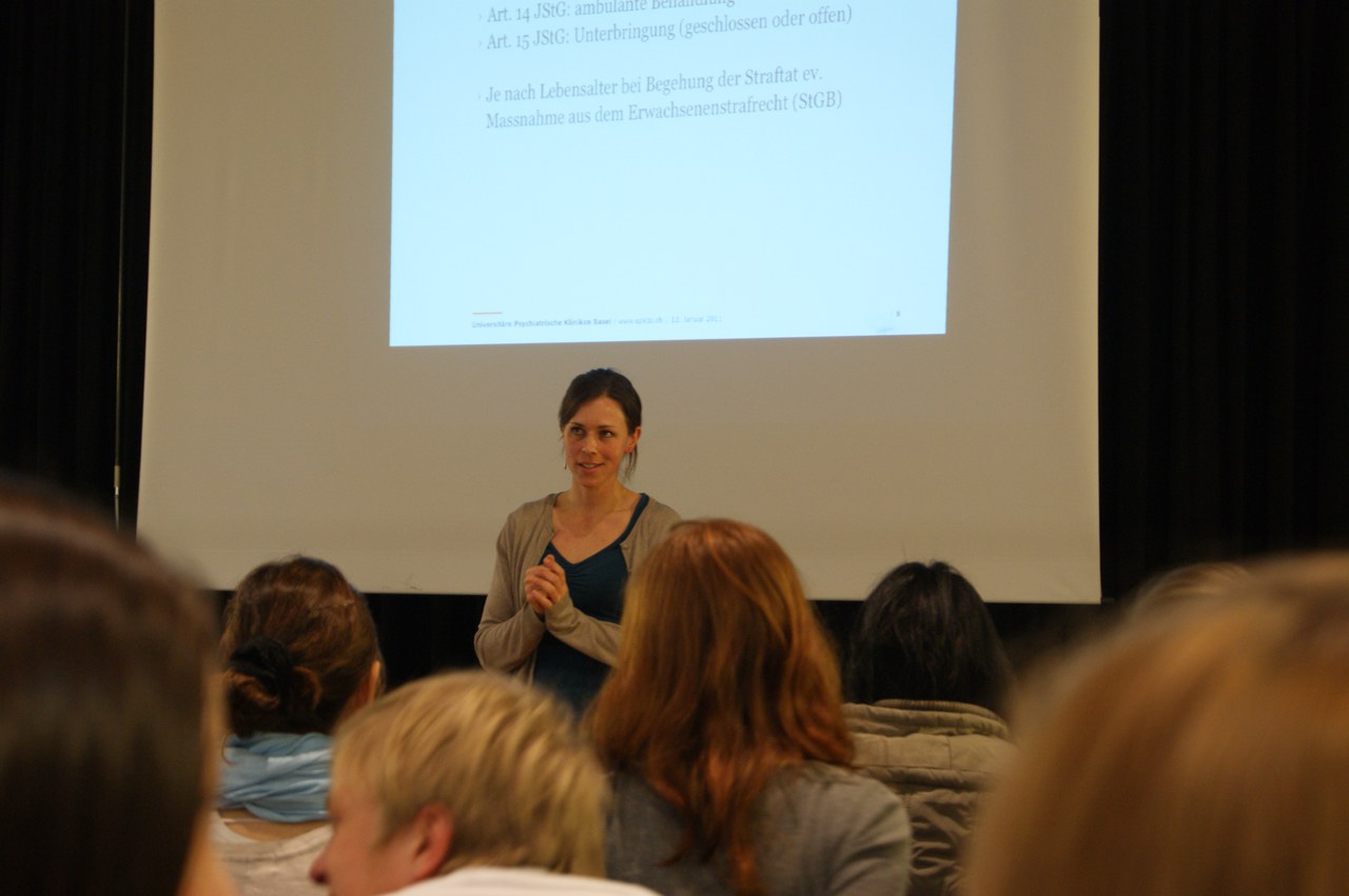 Im Rahmen unseres Themas Berufsfeldorientierung durften wir am 12. Januar 2011 die beiden Psychologinnen der Jugendforensischen Ambulanz der Universitären Psychiatrischen Kliniken Basel (UPK), Frau Célia Danielsson und Linda Duris, in der Aula willkommen heissen. Wir finden den Beruf der forensischen Psychologin sehr interessant und freuten uns schon auf den Besuch. Vor den Schülerinnen und Schülern der 3. Klassen des Schwerpunktfaches PPP gab Frau Danielsson, diplomierte Psychologin, die momentan die erforderliche forensische Zusatzausbildung absolviert, einen kurzen Einblick in ihren vielseitigen und anspruchsvollen Berufsalltag der Jugendforensik und stellte sich den Fragen aller Anwesenden. In den zwei Stunden vermittelte sie uns mit Hilfe einer Powerpoint-Präsentation und Ausschnitten aus dem Film „Faustrecht“ die Aufgabengebiete, die Anforderungen sowie die Sonnen- und Schattenseiten ihres Berufes. Nach einem interessanten Frageaustausch konnten wir mit vielen verschiedenen Eindrücken die Aula verlassen. Von Anfang an fand Frau Célia Danielsson den richtigen Ton und konnte uns die Vielseitigkeit des Berufes deutlich machen. Dadurch, dass wir jederzeit Fragen einbringen konnten, erfuhren wir alles Wissenswerte und so war auch die Atmosphäre entspannt, aber keinesfalls gelangweilt. Im ersten Teil der Veranstaltung gab sie viele Informationen zum Beruf des Gerichtspsychologen/-psychiaters. Sie sagte, welche Ausbildung man braucht, nämlich entweder ein Psychologiestudium und eine anschliessende Ausbildung oder ein Medizinstudium und ebenfalls eine etwas verkürzte Zusatzausbildung. Ausserdem gab sie einen Einblick in ihre Arbeit mit jugendlichen Straftätern. Dabei konzentrierte sie sich vor allem auf die therapeutischen Möglichkeiten mit den vor allem männlichen jungen Tätern. Auch ging es um die Frage, welches Recht gelten soll - das mildere Jugendrecht oder das härtere Erwachsenenrecht. Nach diesem ersten ziemlich theoretischen Teil stellten die Schülerinnen und Schüler viele Fragen zu ihrer Arbeit, wie z.B. ob sie schon einmal von den Jugendlichen angegriffen worden sei oder was für Straftaten die Jugendlichen begangen hätten, welche zu ihr kämen. Allerdings lenkten unsere Einwürfe teilweise vom Thema ab, sodass wir uns, unserer Meinung nach, zu sehr mit der Gefahr eines körperlich-gewalttätigen Angriffs von Seiten eines der Klienten auf Frau Célia Danielsson beschäftigten, als dass wirklich das Risiko dazu besteht. Ein anderer Aspekt, der sehr breit erläutert wurde, waren die Therapiemöglichkeiten. Es wäre doch auch informativ gewesen, zu erfahren, wie es sich mit der Schuldzurechnungsfähigkeit verhält. Das ist allerdings unser einziger Kritikpunkt, denn der Vortrag war mit den vielen interessanten Fakten sowohl über den Beruf als auch das Studium höchst abwechslungsreich. Nach einer kurzen Pause zeigte Frau Danielsson Filmausschnitte aus dem Film „Faustrecht“, der von zwei jugendlichen Straftätern aus der Schweiz handelt. Sie analysierte die beiden unterschiedlichen Fälle auf ihre Gemeinsamkeiten und Unterschiede hin und stellte sich wiederum den vielen Fragen. Nach eineinhalb Stunden war der Anlass vorbei und die Psychologinnen wurden mit Applaus verabschiedet. Wir denken, solche Berufspräsentationen sind gerade im PP-Unterricht sehr aufschlussreich und zeigen, wie viele Wege uns in diesem Fachgebiet offen stehen.