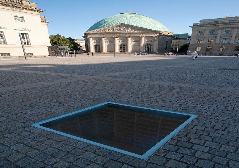 ist. Die Suche nach diesen Steinen begleitete uns auf der ganzen restlichen Reise. Weiter ging es entlang der Straße “Unter den Linden”, welche früher das geographische und geistliche Zentrum war. Danach stoppten wir an der “komischen Oper”, wobei wir beim Namen schmunzeln mussten. Dort wärmten wir uns an den Sonnenstrahlen auf, und erfuhren etwas über die Luftbrücke, welche Westberlin während einem Jahr versorgte. Weiter ging es zum Bebelplatz, wo unser Guide (in Deutschland wird das Wort «Führer» nicht gerne gehört) uns ein Denkmal zeigte,welches man “Entweder anschauen oder einfach rüber hinweg laufen kann, ohne gezwungen zu sein, es wahrzunehmen” wie er uns erklärte. Dieses war das Denkmal zur Erinnerung an die Bücherverbrennung, wo man leere Bücherregale erkennen kann.