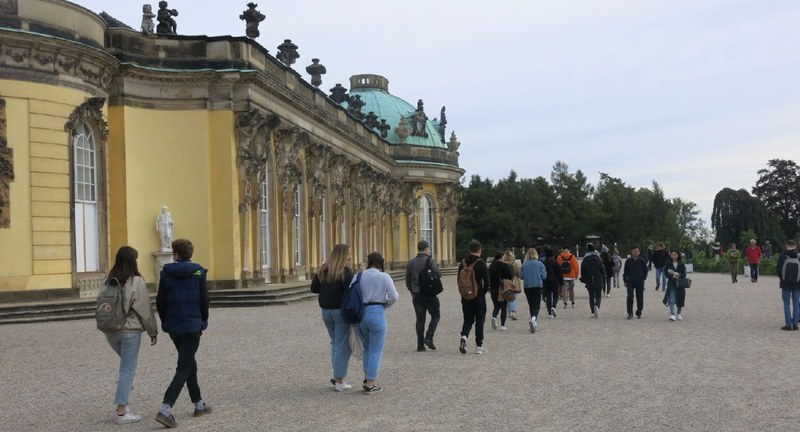 Am Mittwoch den 26.September gingen wir auf die Exkursion zum Schloss Sanssouci. Zuerst sind wir ziemlich lange mit der S-Bahn gefahren und hätten danach noch den Bus nehmen müssen. Jedoch entschieden sich die Lehrpersonen zu Fuss zu gehen, weil wir ansonsten zu spät ankommen wären. Auf dem Weg fuhr jedoch unser Bus an uns vorbei – was für ein Pech. Am Schloss angekommen, haben wir unsere modernisierten Versionen der Geschichte des Briefaustausches zwischen Voltaire und Friedrich II., theatralisch vorgestellt. Danach hatten wir Zeit die Umgebung vom Schloss zu erkundigen und viele haben schöne Fotos gemacht. Das Schloss von Friedrich II. hätten wir uns viel grösser und pompöser vorgestellt. Die Dekorationen der Zimmer waren sehr umfangsreich und farbig und ob es jetzt einem gefällt oder nicht, ist vom individuellen Geschmack abhängig.