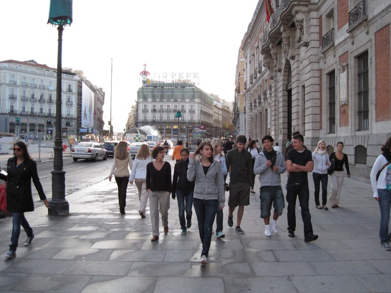 Mit gepackten Koffern und dem ersten Kaffee im Magen fuhren wir am Samstagmorgen kurz nach 9 Uhr mit dem Car von Salamanca ab. Nach einem kurzen Zwischenhalt an einer Raststätte gab es im Car noch eine unterhaltsame Witzeinlage (Jeder durfte per Mikrofon einen Witz erzählen, der beste kam von Adrian ...), bevor wir dann um circa 12 Uhr in Madrid im guten alten Hostal Matute ankamen. Zmittag gabs im Supermercado nebenan. Später spazierten wir zusammen durch das moderne Madrid. Beim Stadion Santiago Bernabéu hörten wir den Vortrag von Adrian über "el Fútbol en Madrid", schauten uns im Real Madrid-Adidas-Store um und ein paar von der Klasse kauften sich Tickets für den Fussball-Match Real Madrid - Tenerife. Dann fuhren wir mit der Metro zurück ins Zentrum der Stadt, wo wir uns in einer grossen Buchhandlung spanische Lektüre für die 4. und 5. Klasse besorgen konnten. Der eine Teil der Klasse ging danach shoppen, ins Kino und später "chocolate con churros" essen (eine Spezialität in Madrid). Die anderen fuhren direkt zurück zum ziemlich vollen, unglaublichen Estadio Santiago Bernabéu und schauten 90 Minuten dem wertvollsten Fussballverein der Welt zu. Die erste Halbzeit war ziemlich unspektakulär, die Fans neben uns und das Fotografieren von Ronaldo, Kaká und Co. unterhielt uns aber trotzdem. Danach zeigten die Madrileños mit einem 3:0 natürlich doch noch was sie können. Später trafen wir uns alle wieder zu einem gemeinsamen Abendessen. Danach checkten wir zusammen das Nachtleben Madrids. Wir fanden einen guten Club, wo wir solange tanzten bis Sr. Larghi und Esperanza die Musik nicht mehr so gut fanden. Kurz nach Mitternacht ;-) waren wir dann alle wieder im Hostal und fielen müde in unsere Betten.