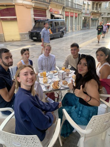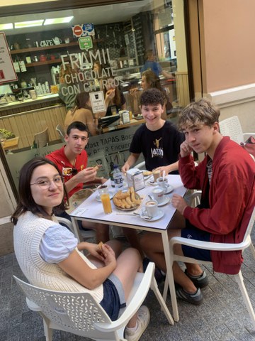 Donnerstag war unser letzter Tag in Malaga. Wir wollten den Morgen nutzen und gingen nach dem Packen alle zusammen früh los in Richtung Zentrum. Dort teilten wir uns in zwei Gruppen: die Strand- und die Shoppinggruppe. Frau López und Frau Preuss begleiteten die Strandgruppe. Es war wunderschön, früh am Morgen am Strand zu sein. Juan, Andrés und Frau Preuss wagten es, ins kalte Wasser zu tauchen, blieben aber nicht sehr lange drin. Danach spielten wir alle zusammen Beachvolleyball. Ein paar einheimische Mädchen schauten uns zu und fragten, ob sie mitspielen durften. Natürlich durften sie das! Leider ging die Zeit schnell vorbei, um 11.00 Uhr mussten wir wieder zurück. Da hatte Andrés die Idee, E-Trottinette zu mieten, um schneller vorwärts zu kommen, denn das Hostel war nicht gleich um die Ecke. Dies erwies sich nicht nur als eine gute Idee, sondern auch als ein lustiges Erlebnis mit den Lehrpersonen.