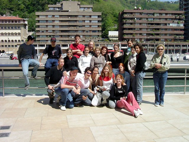 Wir standen um 7.00 Uhr auf und assen Frühstück. Kurz vor 8.00 Uhr trafen wir uns vor der „Residencia“, da um 8.00 Uhr unser Bus losfuhr. Die Fahrt nach Bilbao führte uns durch wunderschöne Landschaften, die sehr unterschiedlich und abwechslungsreich waren. So sahen wir z.B. unzählige Rebfelder, Hügel, Wälder, „Bodegas“ (logisch!) und im Hintergrund sogar Schneeberge. Nach ca. 2. Stunden kamen wir in Bilbao an und nahmen dort das Tram (sehr ähnlich wie unsere Combinos!) in Richtung Guggenheim-Museum. Das Gebäude des Guggenheim Museums Bilbao ist sehr eindrücklich und so fing die Führung schon ausserhalb des Museums an. Der Architekt, Frank O. Gehry, hat hier ein bildhauerisches Bauwerk entworfen, dass von vielen als Vorreiter der Architektur des dritten Jahrtausends bezeichnet wird. Die Kunst, die ausgestellt wird, hat sicher nicht allen gleich gut gefallen, aber es gab schon so einige Sachen, die einem sehr faszinierten. Nach der Führung verliessen wir das Museum auf der anderen Seite, wo wir dann zum Platz des Guggenheims-Bilbao kamen, wo der riesige „Blumenhund Puppy“ steht. Der wurde von uns dann auch kräftig fotografiert und dann gings zur Mittagpause, die alle an verschiedenen Plätzen verbrachten. Als wir dann später die Stadt durchstreiften, sahen wir die typischen „Metroeingänge“ von Bilbao. Wie das so ist, wurden dann auch die Kaufhäuser von uns besucht, wie z.B. „Corte Ingles“ > riesig Zara, der sehr beliebt war. Um 16.15 Uhr traf sich die ganze Gruppe dann wieder bei der Busstation und so gings zurück. Im Bus ruhten die meisten aus oder hörten ihre neugekauften CDs. In Logroño hatten wir noch Freizeit, wo man duschen oder ausruhen oder sonst was machen konnte. Um 21.00 Uhr gabs z’Nacht. (In Spanien isst man um 15.00 Uhr z’Mittag und um 21.00 Uhr oder später Abendbrot.) Wir gingen später noch in eine Bar, um „Helados“ zu essen. Ja, und dann war auch schon dieser Tag wieder vorbei und wir träumten von den vielen, neuen Erlebnissen.