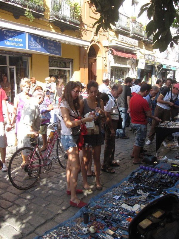 Unser «Ausflug» durch die Sehenswürdigkeiten Sevillas begann mit dem Besuch eines grossen, neuen Bauwerks, dem Metrosol Parasol. Der Metrosol Parasol ist eine Konstruktion modernster Architektur aus Beton und Holz und einem sehr speziellen Dach: Auf die lamellenartigen Holzteile hat der Architekt einen kurvigen Weg gesetzt, von dem sich jeder Winkel Sevillas aus luftiger Höhe erblicken lässt. Wieder unten angekommen machten wir uns auf dem Weg zum mercadillo de la calle Feria, einem Flohmarkt in einer der lebendigsten Strassen des Stadtviertels La Macarena. Das bunte Treiben auf der Strasse und den umliegenden Plätzen war ein stimmungsvolles Erlebnis, auch wenn nicht alle etwas kauften. Unser nächstes Hauptziel war das Centro Andaluz de Arte Contemporáneo, kurz CAAC, was auf Deutsch Zentrum für moderne Kunst heisst. Dieses Museum unterscheidet sich von den andern Museen, die wir besucht haben, weil es in ein altes und sehr schönes Kloster integriert ist, das heute ausschliesslich der Kunst zur Verfügung steht. Es stellt in verschiedenen Themengebieten die Werte unserer Zeit (und unserer Jugend) dar. Sehr eindrücklich war zum Beispiel ein dunkler Raum, in dem mehrere Menschen an die Wand projiziert wurden, die nur mit Brüllen und Schreien ein abgestimmtes Zusammenspiel erzeugten. Sehr viele, grösstenteils sozialkritische, Gedankengänge wurden an die Wand geschrieben, projiziert oder gemalt. Wie gesagt, es ging um moderne Kunst, das heisst es waren nicht nur Gemälde und Skulpturen, sondern alles, was man als (moderne) Kunst interpretieren konnte.