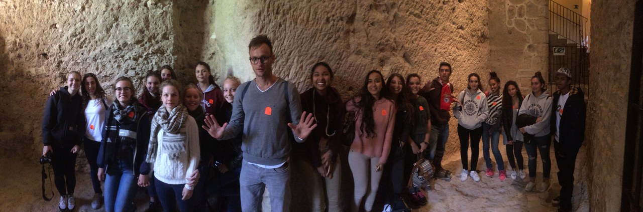 Am Mittwoch, dem dritten Tag unserer Studienreise, sind wir sehr früh aufgestanden, um via Ávila zu unserer neuen Unterkunft in Salamanca zu fahren. Ca. eineinhalb Stunden nach unserer Abfahrt von Madrid hielten wir an und waren auch schon in Ávila, wo wir zuerst frühstückten und uns anschliessend den spannenden Vortrag von Valeria und Juliana über Spanien unter der Herrschaft von Franco anhörten. Nach diesem Vortrag verkündeten uns Herr Larghi und Herr Büchele, dass wir einen Postenlauf durch Ávila machen werden. Jede Gruppe bekam eine Postkarte mit einer Sehenswürdigkeit und eine Stadtkarte. Nun mussten wir zuerst die Sehenswürdigkeit unserer Postkarte besuchen, eine Postkarte darüber schreiben und entweder an Herrn Larghi oder Herrn Büchele senden. Anschliessend mussten wir noch die anderen Sehenswürdigkeiten besuchen und vor jedem ein möglichst kreatives Selfie machen. Nach diesem witzigen Postenlauf gingen wir alle zusammen auf die alte Stadtmauer von Ávila, die zum Weltkulturerbe gehört. Sie ist seeehr lang, genau genommen über 2,5km. Auf der Mauer, mit ihren 87 Festungstürmen und 2500 Zinnen, schossen wir viele Fotos von uns, aber auch von der Mauer mit Landschaft im Hintergrund. Anschliessend hatten wir alle eine Stunde Mittagspause bis wir unsere Reise nach Salamanca wieder antraten. Als wir losfuhren war die Stimmung ausgelassen, alle waren munter und Herr Larghi verteilte Yemas de Ávila, eine Spezialität aus der Region. Dieses Eigelb ist sehr süss und etwas ungewöhnlich, weshalb es nicht alle mochten. In Salamanca angekommen, bezogen wir unser gemütliches Hostel „Sweet Home Salamanca“, legten kurz unsere Koffer ab und machten uns parat, um die Stadt zu erkundigen. Als erstes gingen wir zu der Plaza Mayor, dann erhielten wir eine kurze Stadtführung von Valeria und Isabel, die uns in ihrem Vortrag La casa de las muertes, La casa de las conchas und die Universität von Salamanca zeigten. Nach kurzer Freizeit gingen wir alle zusammen essen und genossen die spanischen Spezialitäten, die uns im Restaurant aufgetischt wurden. Schlussendlich fielen wir alle todmüde ins Bett und freuten uns auf den nächsten Tag.