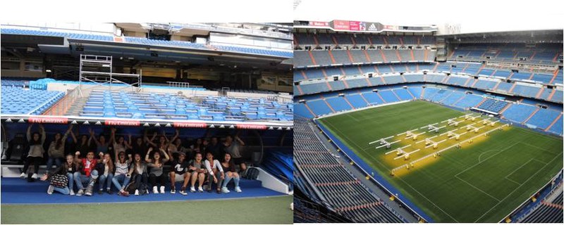 Im Stadion finden wir das langersehnte Wi-Fi und verbringen mit einem weiteren Vortrag und einer ausgiebigen Besichtigung den Rest des Nachmittags. Wobei eine Attraktion die Teilnahme an einem Fussballmosaik ist und wir uns auf der Ersatzbank verhalten als habe es ein Goal gegeben, obwohl kein einziger Spieler in Sicht ist. Sogar die Duschen und den Kongresssaal, mit einem Interview unseres Mitschülers über seinen Haarschnitt, können wir besichtigen. Nach einem weiteren Vortrag ausserhalb des Stadions über die „Movida Madrileña“ essen wir in kleinen Gruppen in verschiedenen Restaurants zu Abend. Unsere Gruppe entscheidet sich für ein Mexikanisches Restaurant mit einem gemütlichen und tollen „ambiente“.