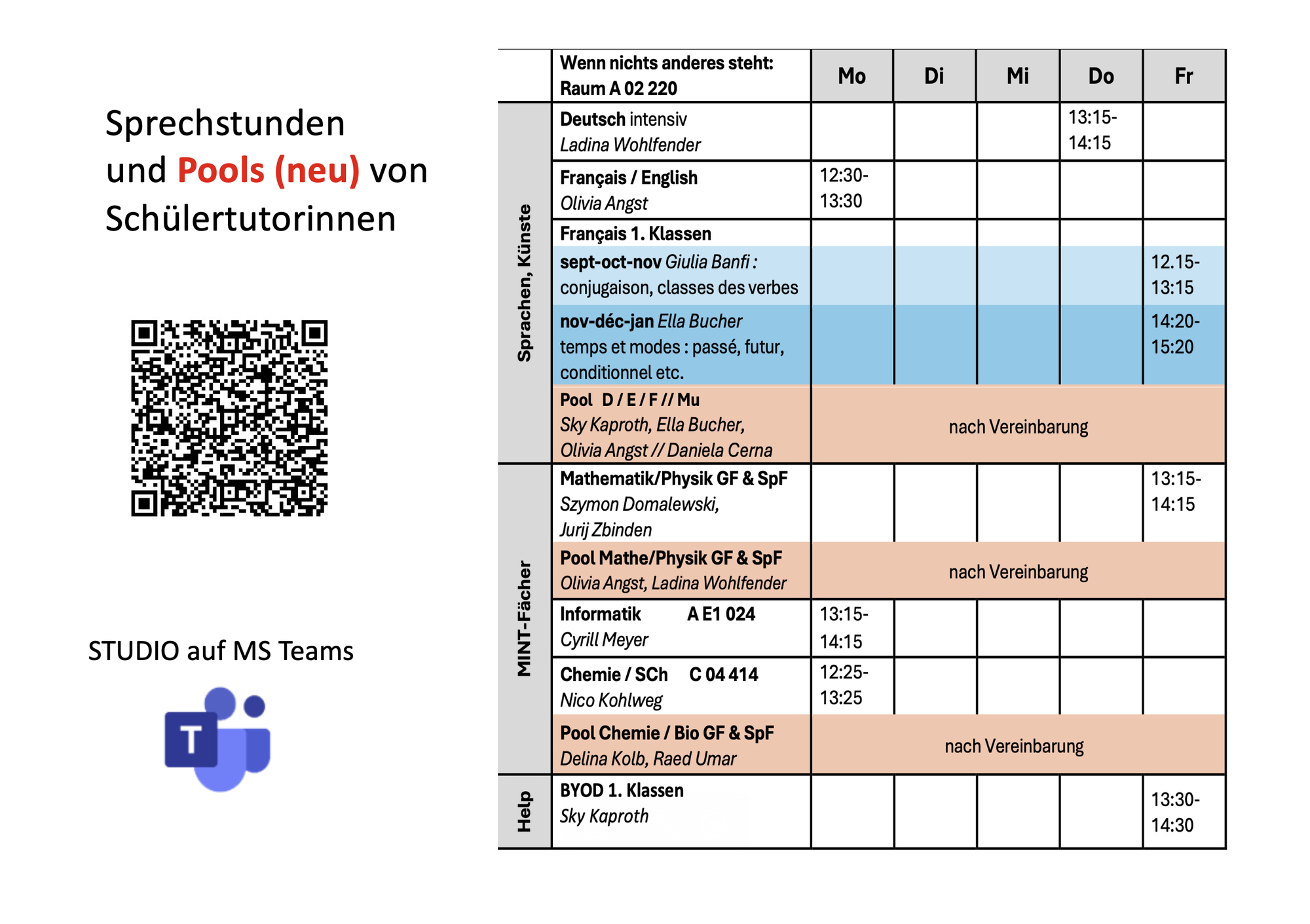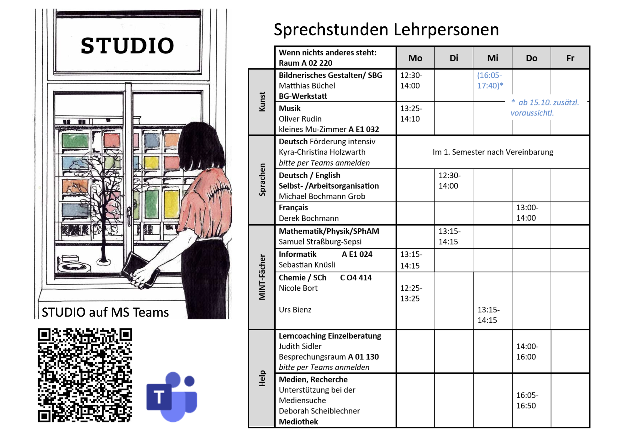 Das Studio bietet Ihnen die Möglichkeit, Lücken zu füllen und bei fachlichen Fragestellungen, die Ihnen beim Lernen begegnen, Hilfe zu finden. In den Sprechstunden sind Lehrpersonen oder SchülerInnen vor Ort und unterstützen Sie in den gewünschten Fächern.